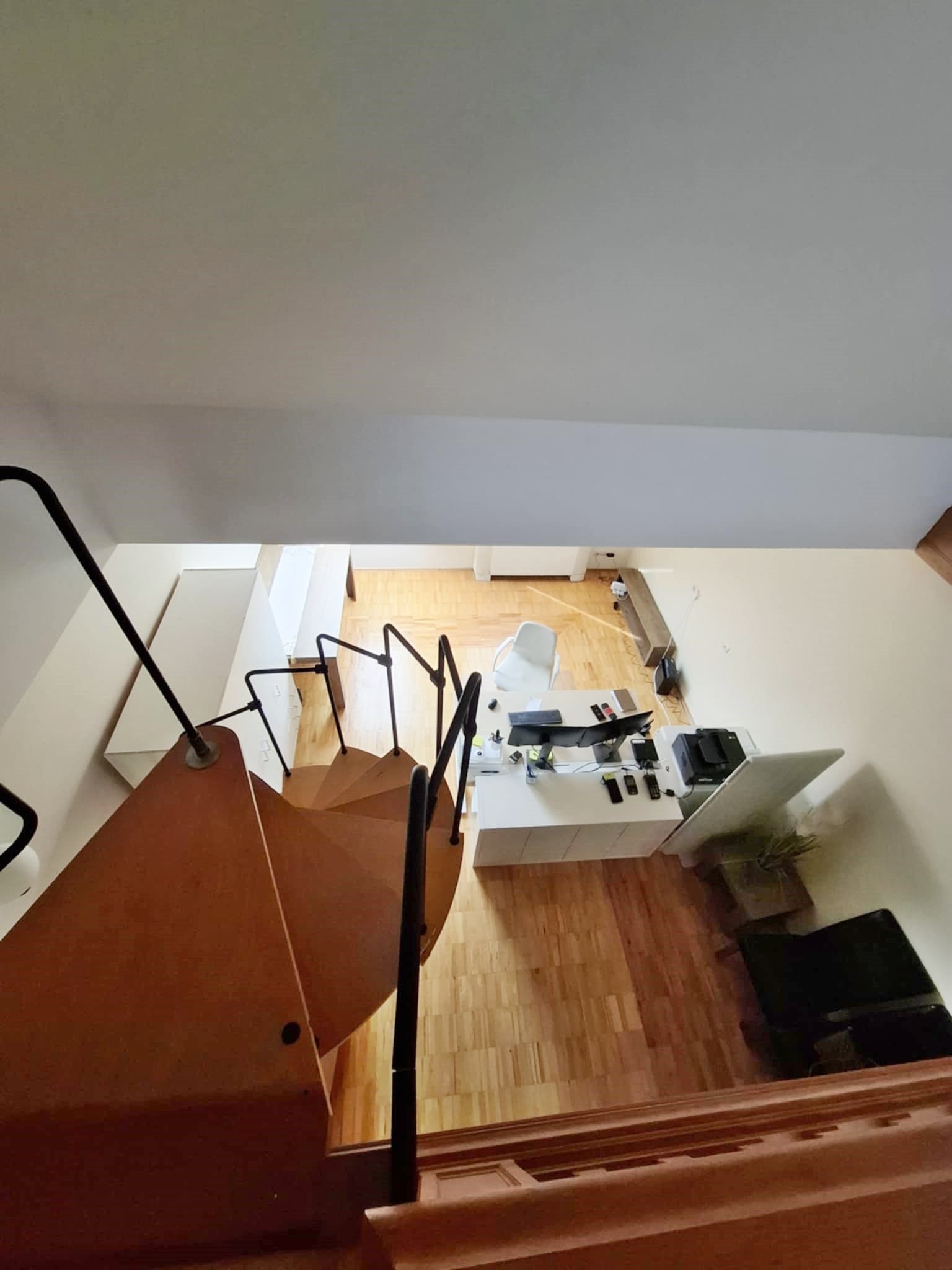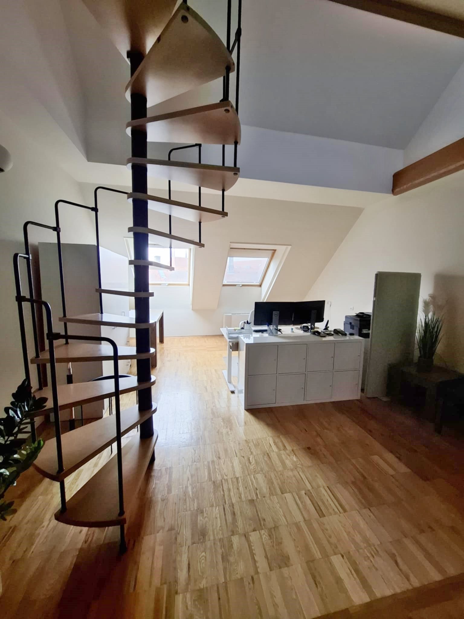 A finoman ívelt csigalépcső nem csupán funkcionális elem, hanem a tér egyik meghatározó látványa.
